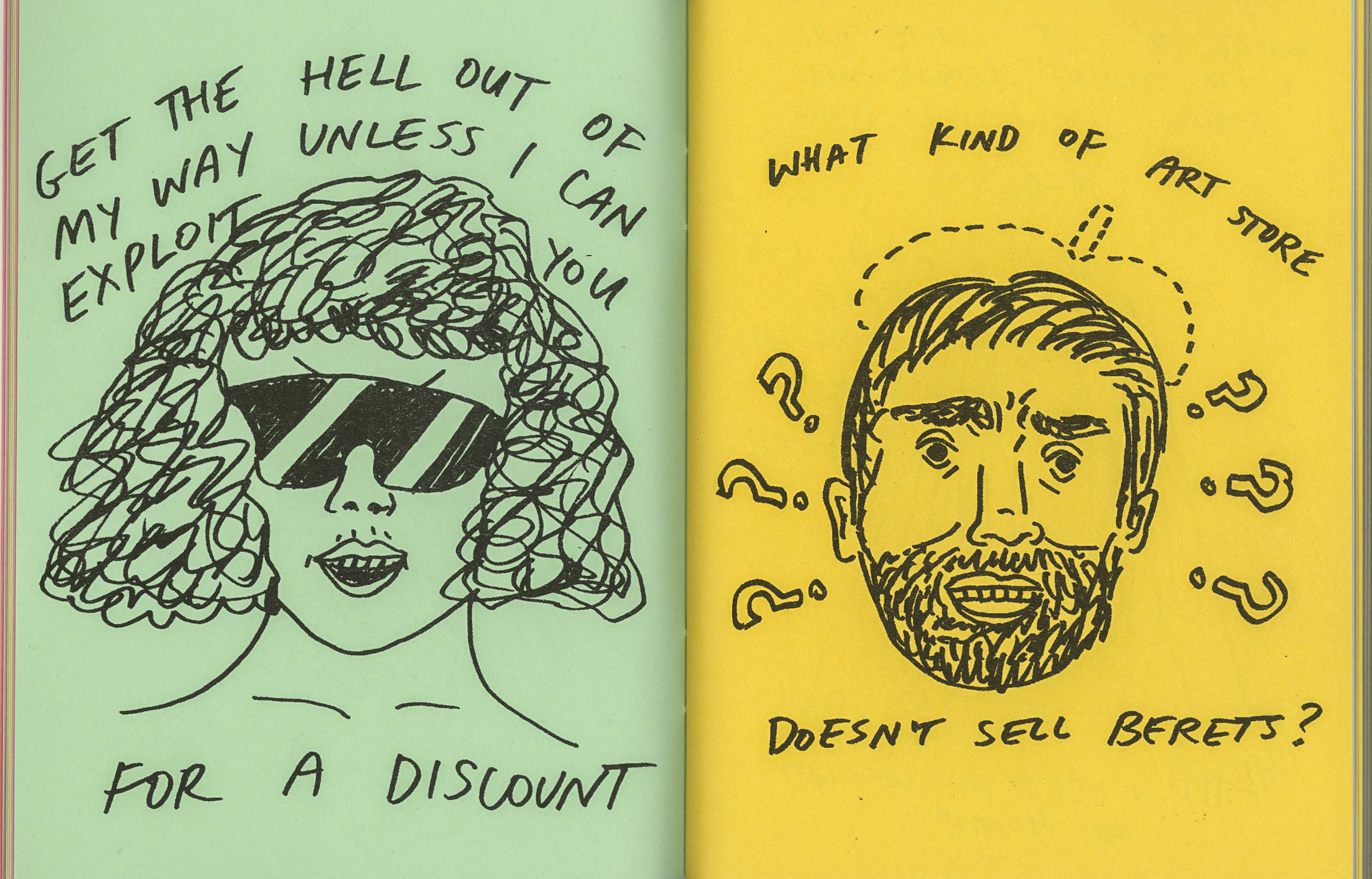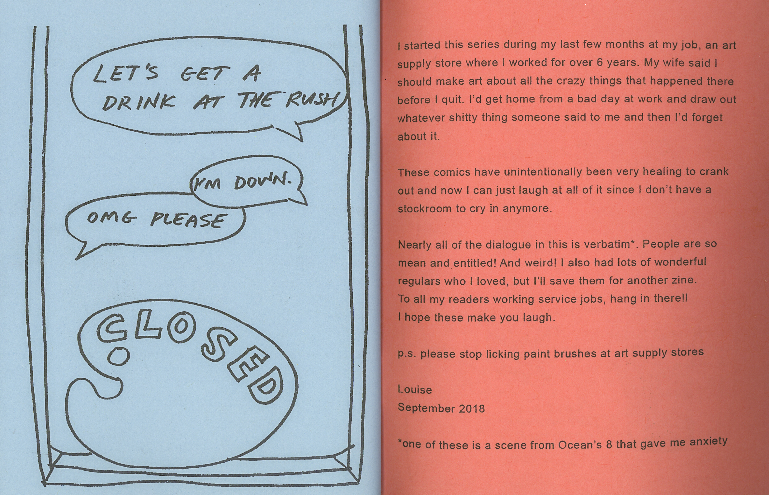 Nearly all of the dialogue in this is verbatim*. People are so mean and entitled! And weird! I also had lots of wonderful regulars who I loved, but I'll save them for another zine.