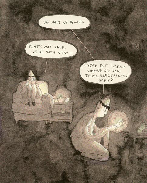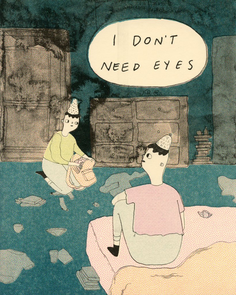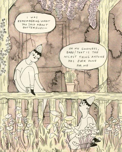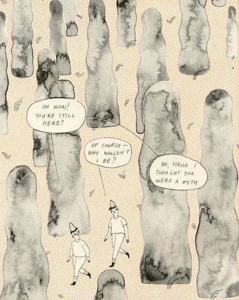 Two characters interact with devastatingly sweet intimacy over 32 pages of dreamlike landscapes rendered in ink washes and dot patterns, printed in three colors.