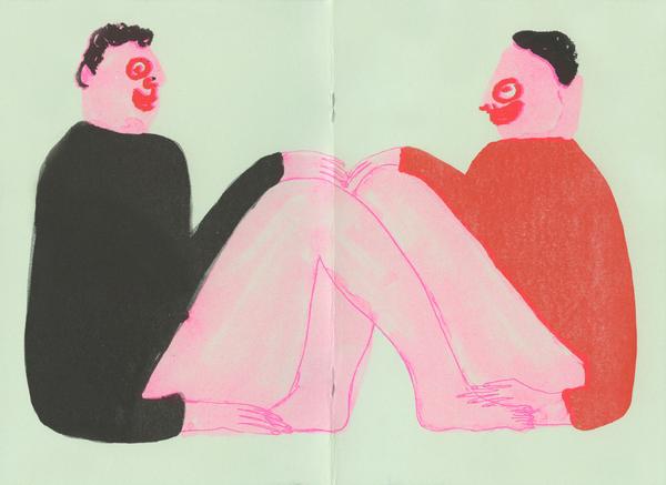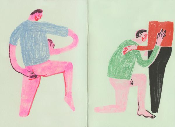 Jeffrey Cheung's 7 color zine on minty green is filled with drawings of dudes being dudes