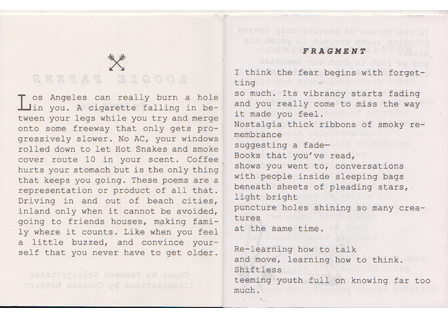FORWARD: "Los Angeles can really burn a hole in you. A cigarette falling between your legs while you try and merge onto some freeway that only gets progressively slower. Nn AC, your windows rolled down to let hot snakes and smoke cover route 10 in your scent. Coffee hurts your stomach but is the only things that keeps you going. These poems are a representation of a product of all of that. Driving in and out of beach cities, inland only when it cannot be avoided, going to friends houes, making family where it counts. Like when you feel a little buzzed, and convince your self that you never have to get older"