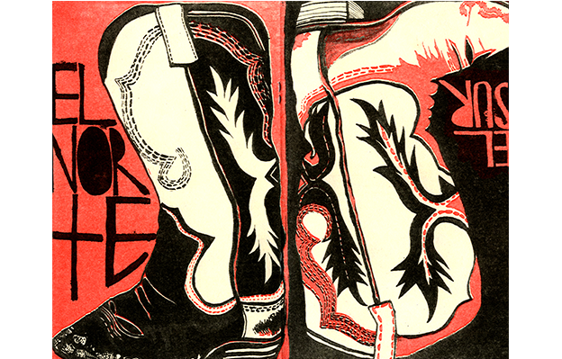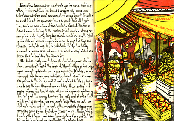 The zine is split into 2 sections entitled "Bolivia" and "Argentina", each on opposite ends of the book. These sections meet in one middle page, creating a story that can be flipped around and read from either direction. The cover is also reversible and both sides of the cover are different.