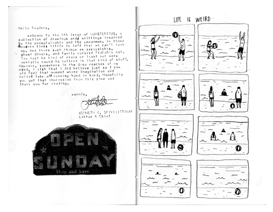 "Welcome to the 5th issue of Monsteritus #5, a collection of drawings and writings inspired by the unexplainable and the uncommon.. In these modern times little is left that we can’t look up. Are there such things as sasquatches, ghost divers, and family curses? Probably not; you must be kind of crazy or at least not very mentally sound to believe in that kind of stuff. However, somewhere in the deep reaches of my mind, I wish that I did believe just so I could feel that moment where imagination and belief take off running hand in hand. Hopefully you get that impression from this zine and thank you for reading"