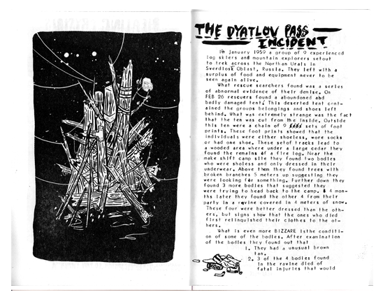 A zine about the strange and unusual events. Written words and line drawings dealing from the occult to cryptology.