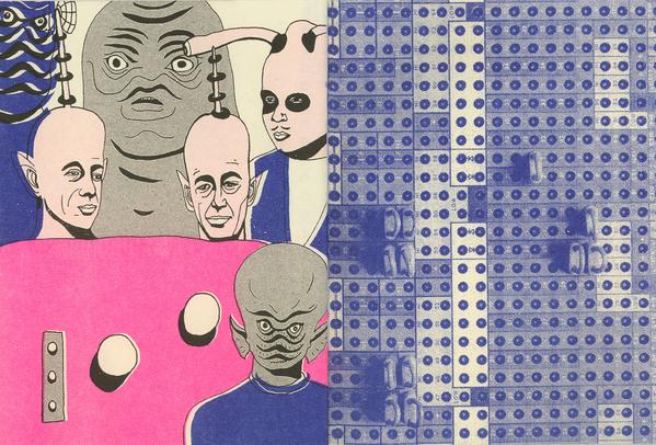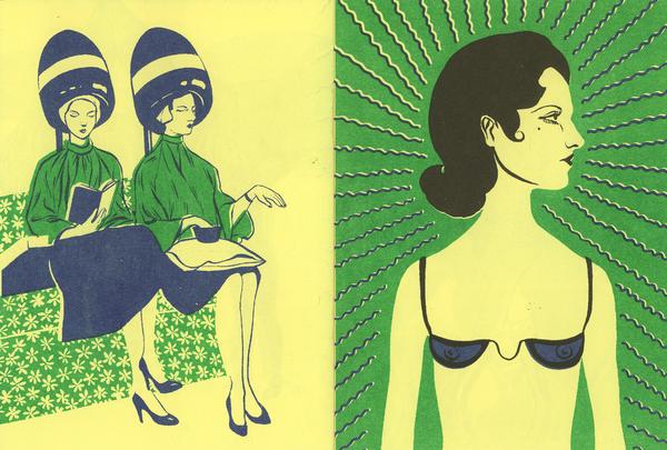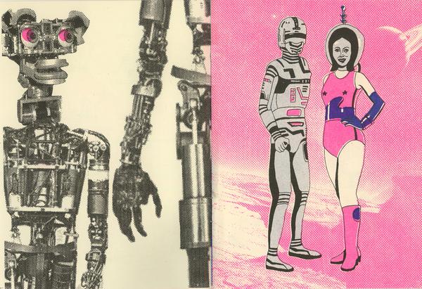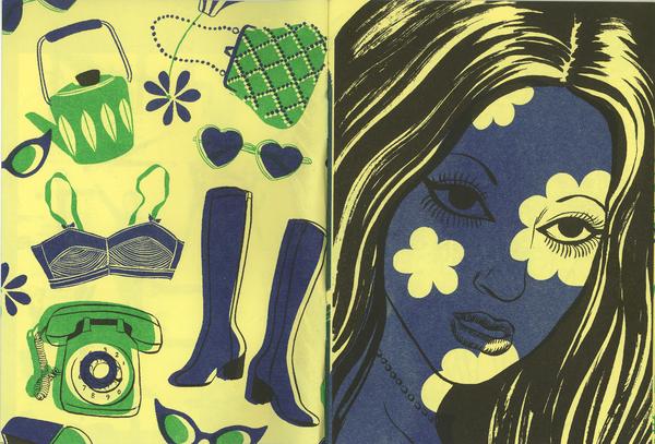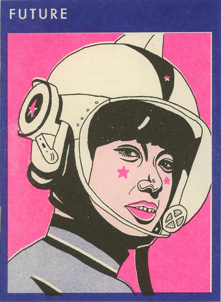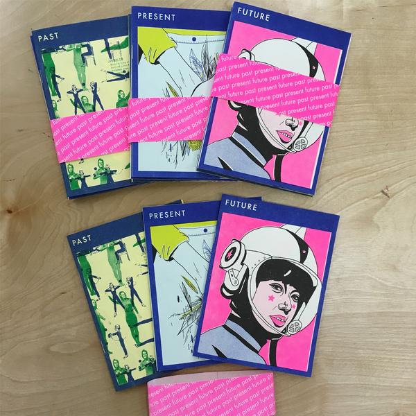 A set of three 16-page mini zines bound together with a bright pink band. Featuring space babes, contemporary babes, and vintage babes in bright greens, yellows, pinks and blues.