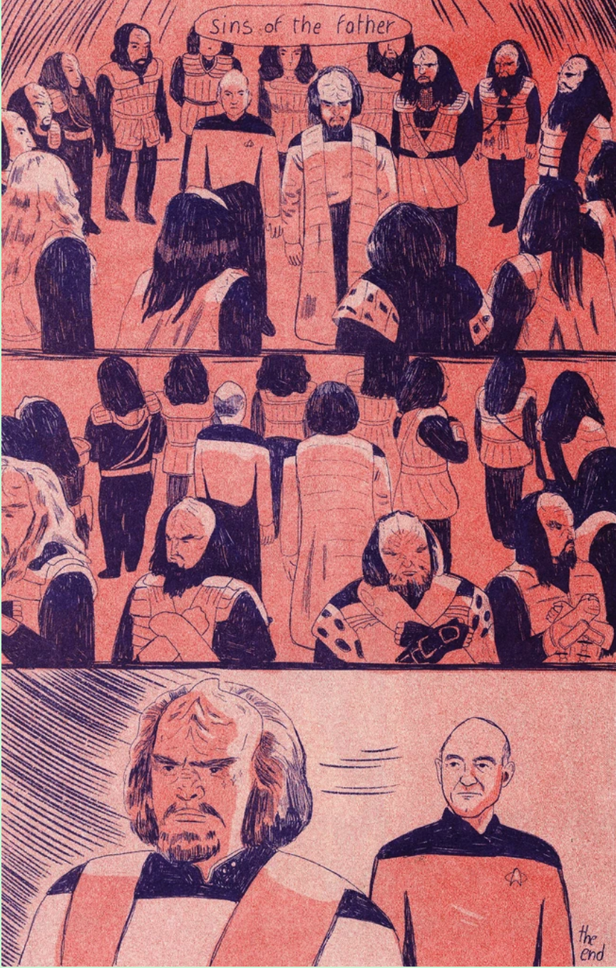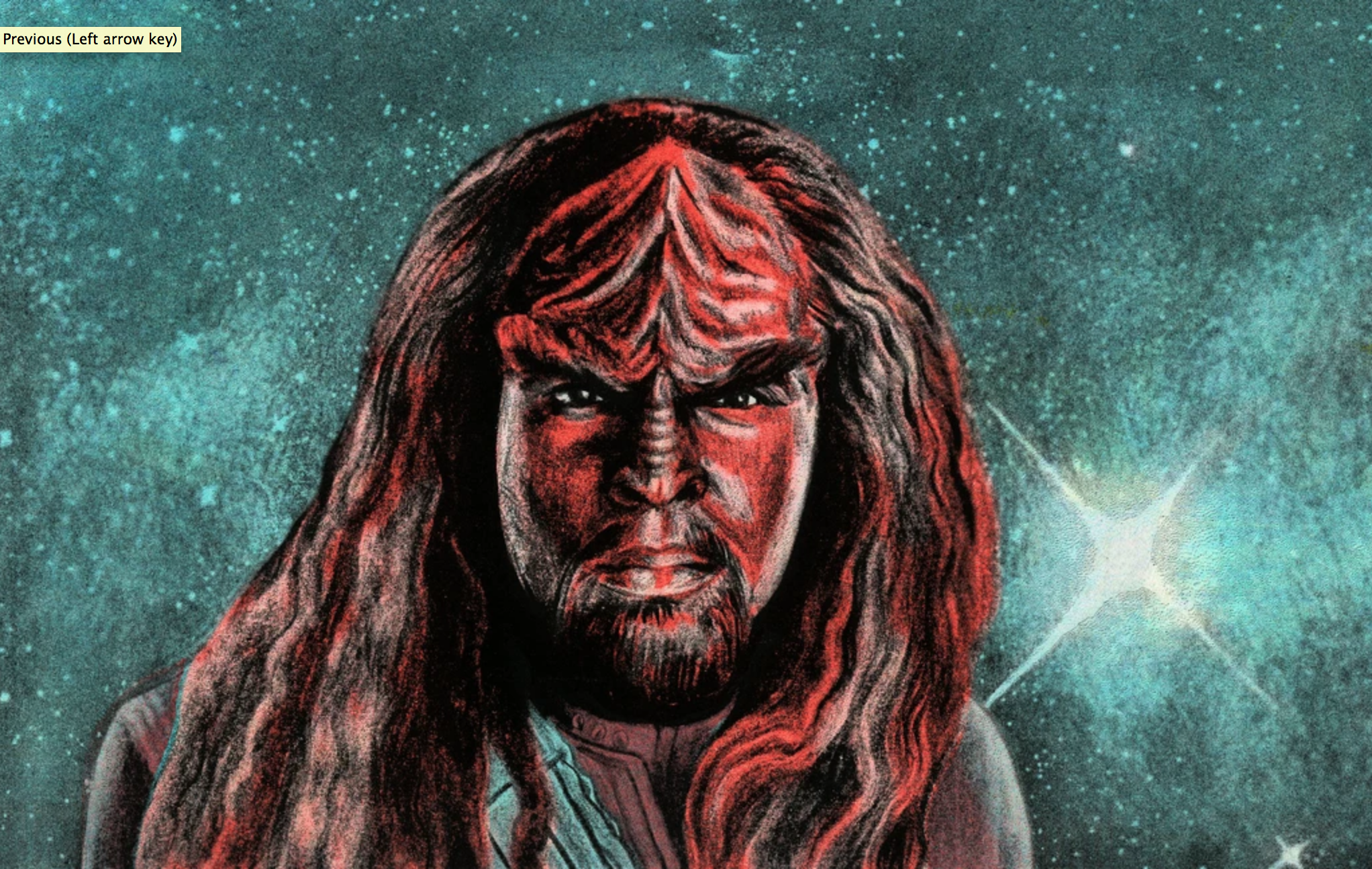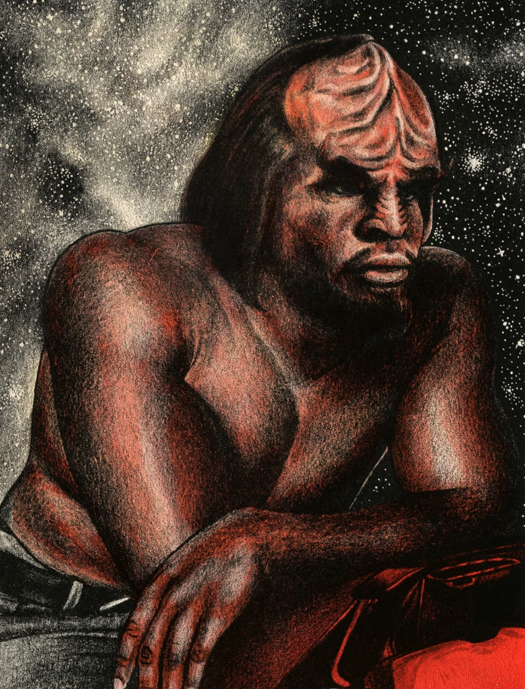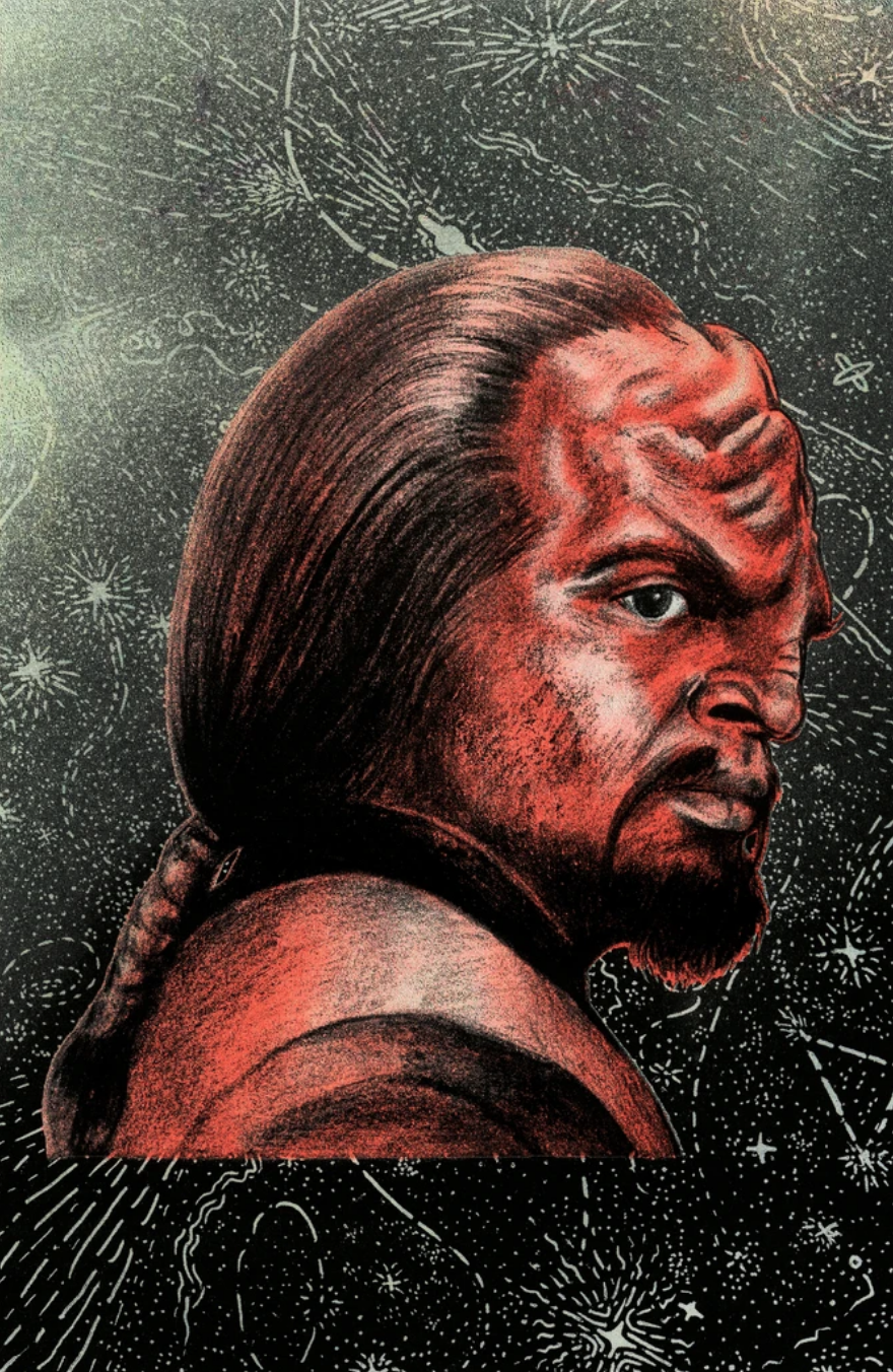 The artists love Worf for his strength, integrity, and ongoing search for identity and self-determination in a universe full of cultural contradictions and duty-bound roles. He appears in more iterations of the Star Trek universe than any other character. His complex development over time, grappling with the human and Klingon parts of himself, is a powerful example of representation.