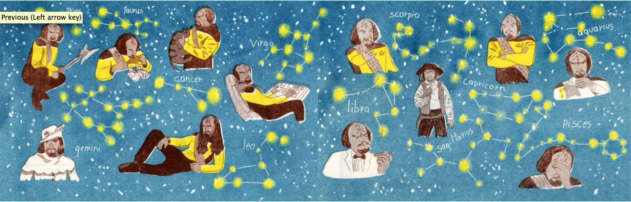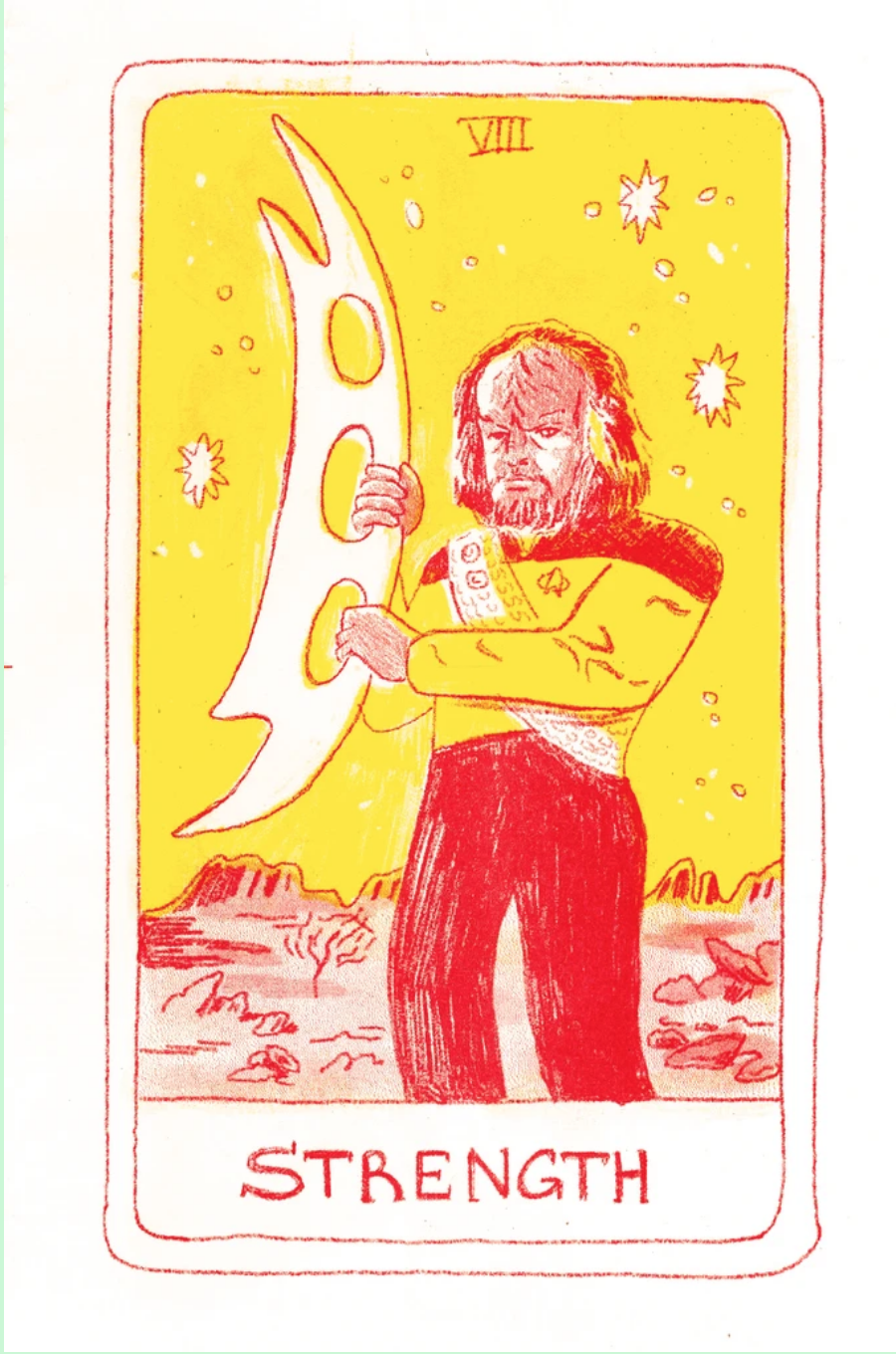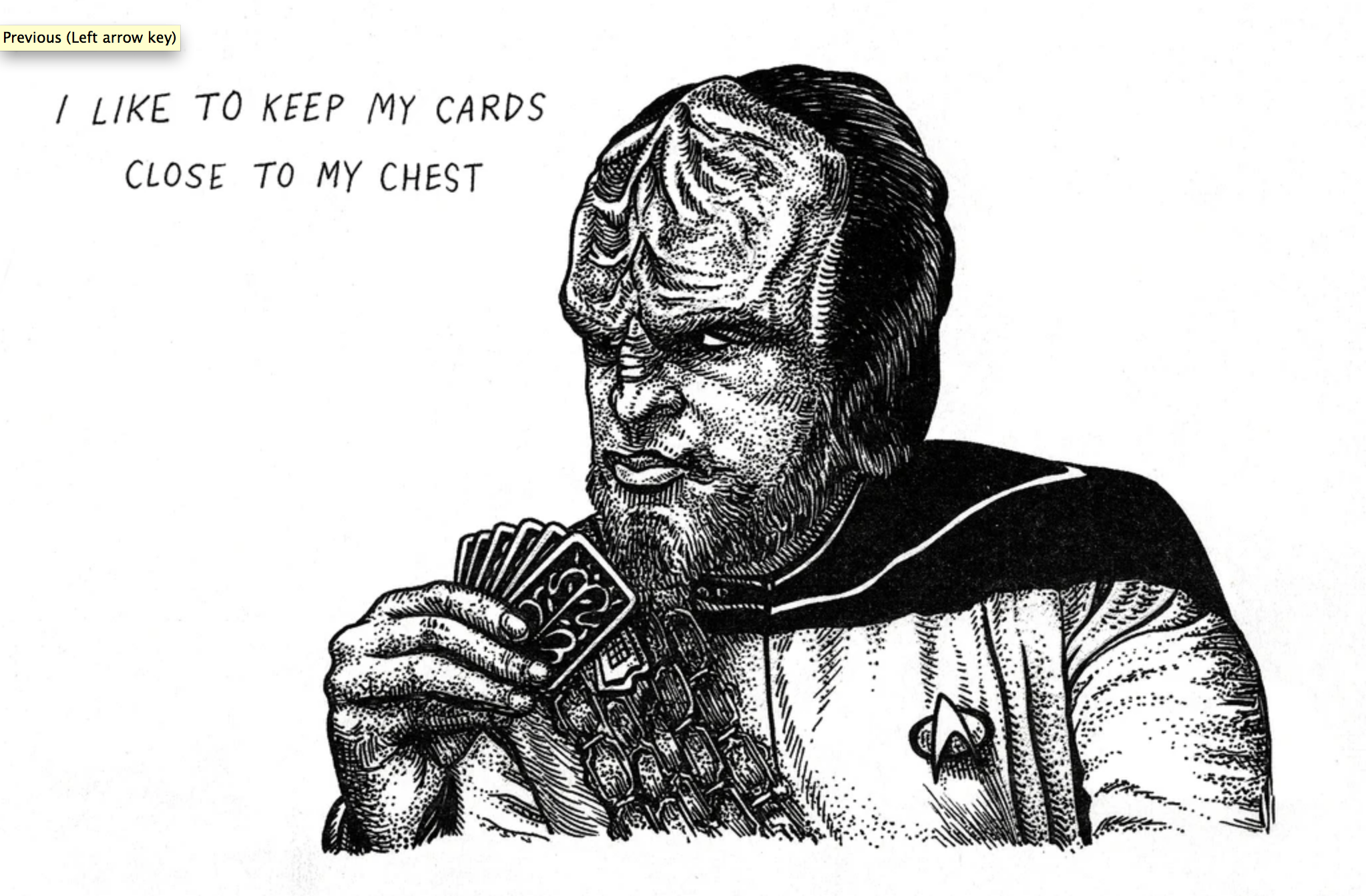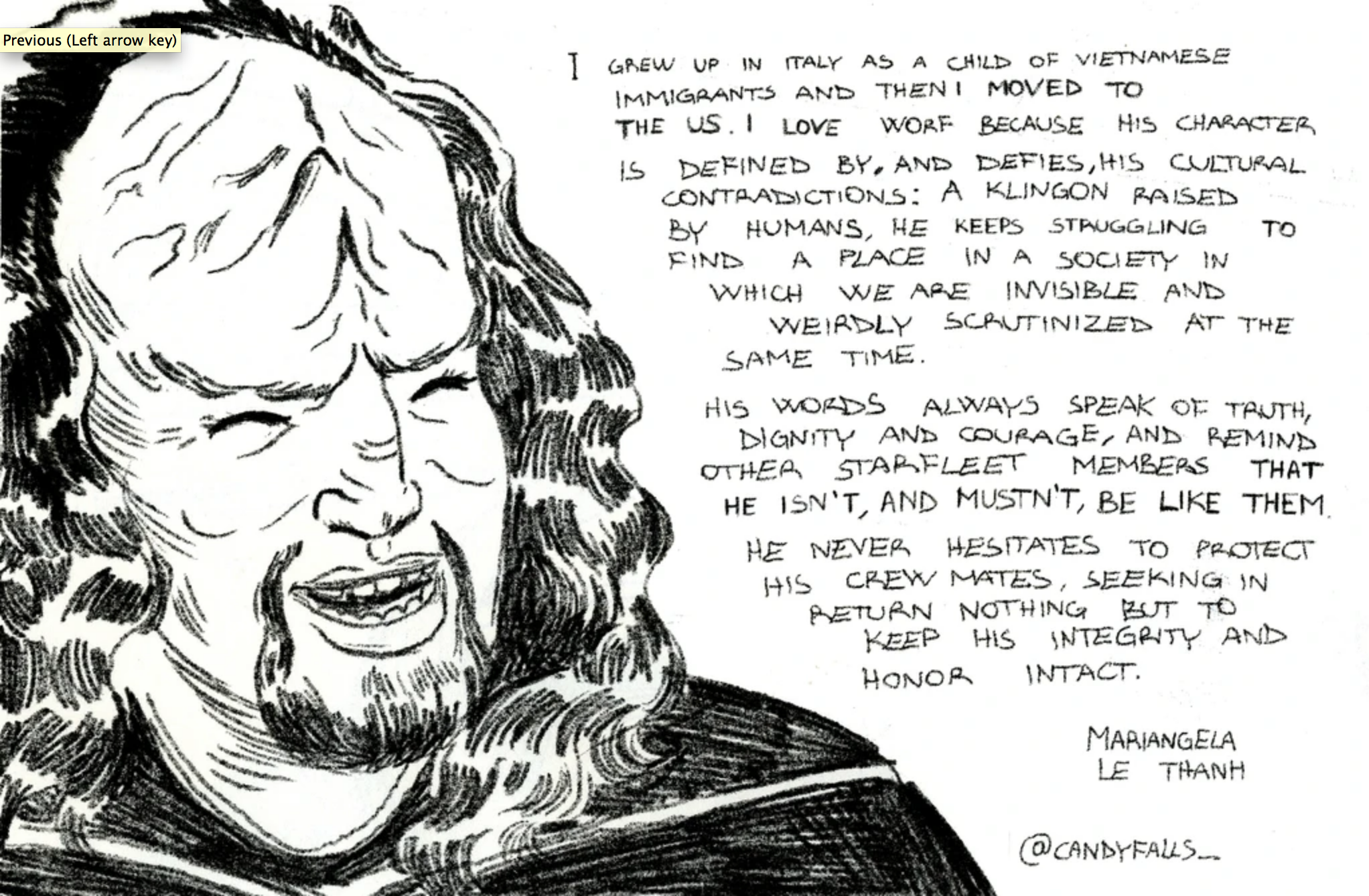 The artists love Worf for his strength, integrity, and ongoing search for identity and self-determination in a universe full of cultural contradictions and duty-bound roles. He appears in more iterations of the Star Trek universe than any other character. His complex development over time, grappling with the human and Klingon parts of himself, is a powerful example of representation.
