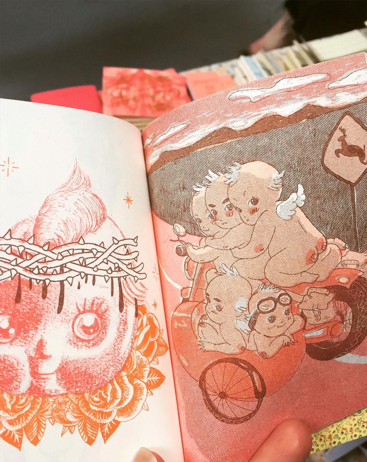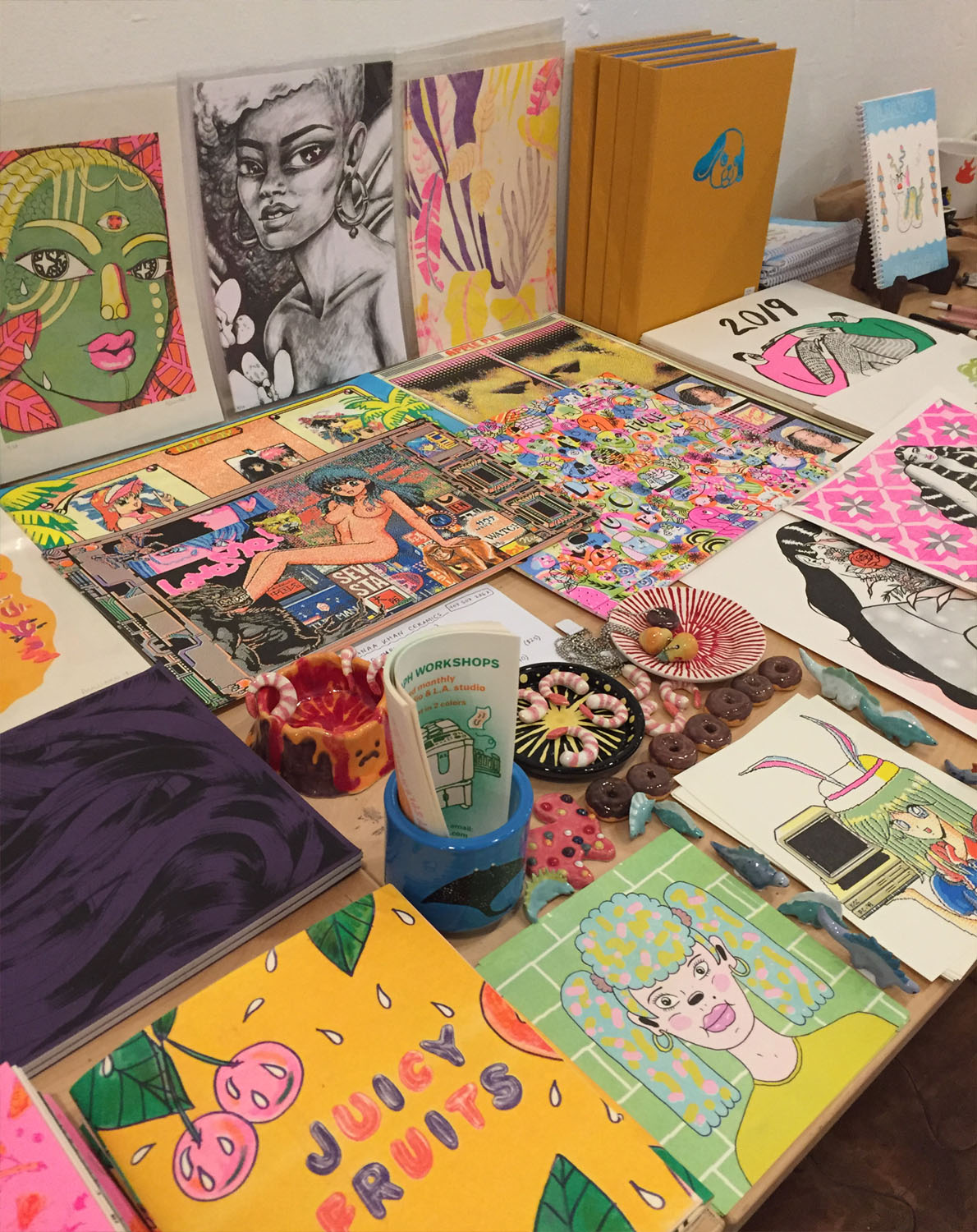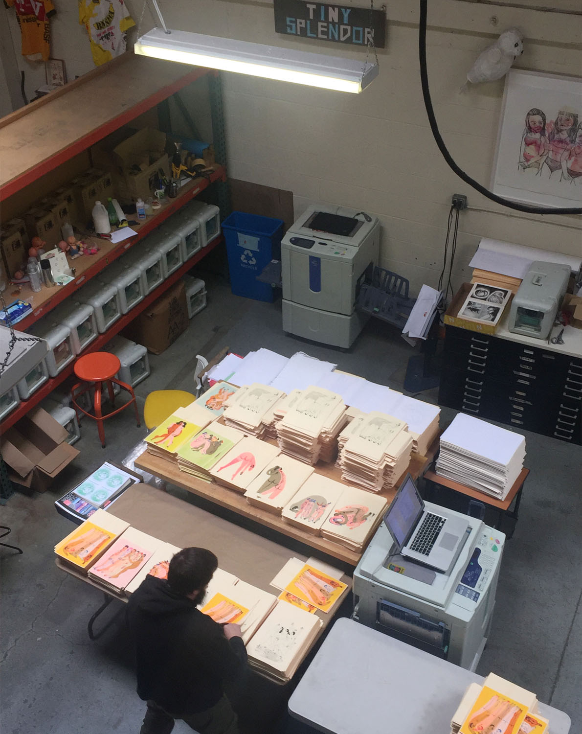 Tiny Splendor started in 2012 as a tiny collective, traveling around sharing our and our friends’ artwork out of a small wooden fold-up gallery. We’ve since grown into two separate studios, one in Berkeley and one in Los Angeles, providing print and publishing services to artists locally and from around the world. We continue to pursue self-publishing and a love of ink on paper, producing print editions, zines, books, apparel and more.